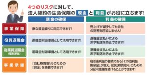 法人向けに強みあり、「事業保険、役員退職金、従業員退職金、事業承継」と4つのリスクについて経営者向けにニーズに応じた提案が可能。